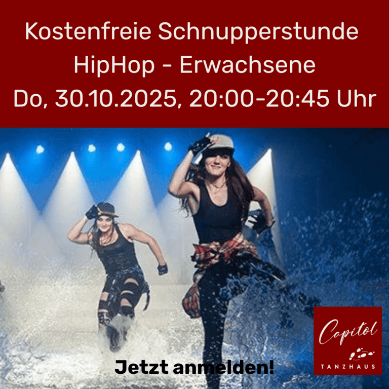 Am Donnerstag, 30.10.2025, von 20:00–20:45 Uhr laden wir herzlich zu unserer HipHop-Schnupperstunde für Erwachsene im Capitol Tanzhaus ein.