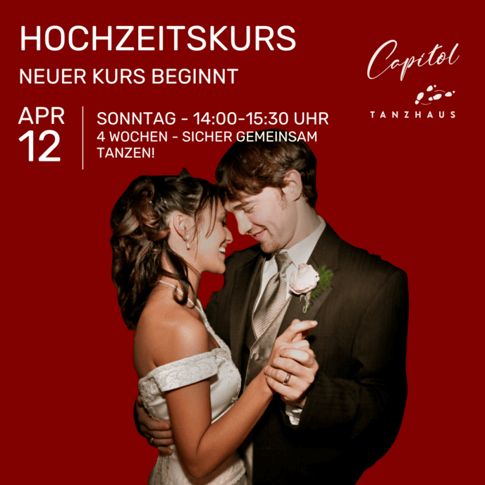 In unserem Hochzeitskurs lernt Ihr in nur 4 × 90 Minuten die wichtigsten Tänze für eine gelungene Feier – ganz gleich, ob es Eure eigene Hochzeit ist oder ein anderes festliches Ereignis. Viel wichtiger als perfekte Schritte ist dabei das Gefühl: